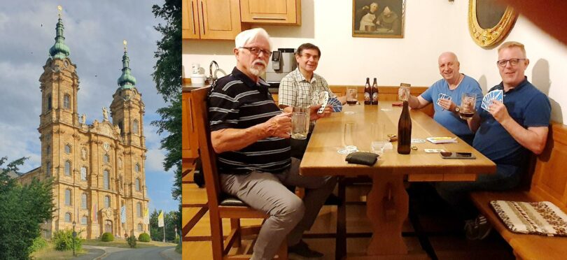 Inzwischen sind fünf Jahre vergangen: Höchste Zeit, zumindest einem der geistlichen Schafkopf-Veteranen aus Berlin, an seiner neuen Wirkungsstätte zu besuchen. So haben sich drei Spieler vom „Verein der Bayern in Berlin“ auf dem Weg gemacht, Pater Maximilian in Vierzehnheiligen zu besuchen, mit dabei neben Franz Mayr, Norbert Odenbach und Helmut Amberger, der 1. Vorsitzende des Vereins. Mit Pater Maximilian war somit eine spielfähige Viererrunde gegeben.