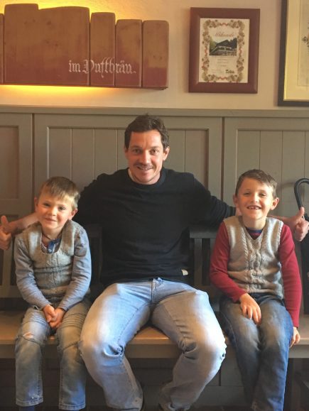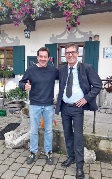 Der beliebte Fernsehschauspieler Markus Brandl (42) hat bei einem Ausflug auf den Duftbräu/Samerberg eine kleine Verschnaufpause von den Dreharbeiten genommen. Mit der Region ist Brandl eng verbunden: in Rosenheim geboren und in Brannenburg aufgewachsen, durfte er dort im italienischen Restaurant seines Stiefvaters mithelfen. Als „Tobias Herbrechter“ spielt er seit 2009 eine Hauptrolle im ZDF-Renner „Die Bergretter“. Gerade wurde die 9. Staffel der „Bergretter“ fertig gedreht, sie wird ab 9. November sechs mal 90 Minuten lang um 20.15 Uhr im Zweiten ausgestrahlt. Dann sitzen auch die Samerberger Fans vom Duftbräu, Lorenz Wallner (links) und Matthäus Wallner (rechts) vor den TV Geräten und bewundern ihren Bergretter. Auch Bürgermeister Georg Huber holte sich vom TV-Star ein Autogramm. „Lorenz und Matthäus sind ein richtiger Fan von Markus Brandl und sie waren ganz stolz über diese Begegnung“, so Vater und Duftbräu-Wirt Markus Wallner nach dem Besuch des Fernsehstars auf dem Samerberg.