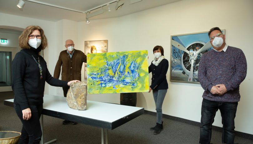 Foto: Anita Berger: (v.l.n.r.) Eine Skulptur von Walther Wohrizek und ein Gemälde von Liesbeth Wohrizek erweitern Dank Schenkung die Priener Sammlung: Die Priener Kulturreferentin Karina Dingler, der Vorsitzende des Kulturfördervereins Dr. Friedrich von Daumiller und die Geschäftsführerin der Prien Marketing GmbH Andrea Hübner nehmen die beiden Kunstwerke von Nachlassverwalter und Galerist Guido Wichmann entgegen.