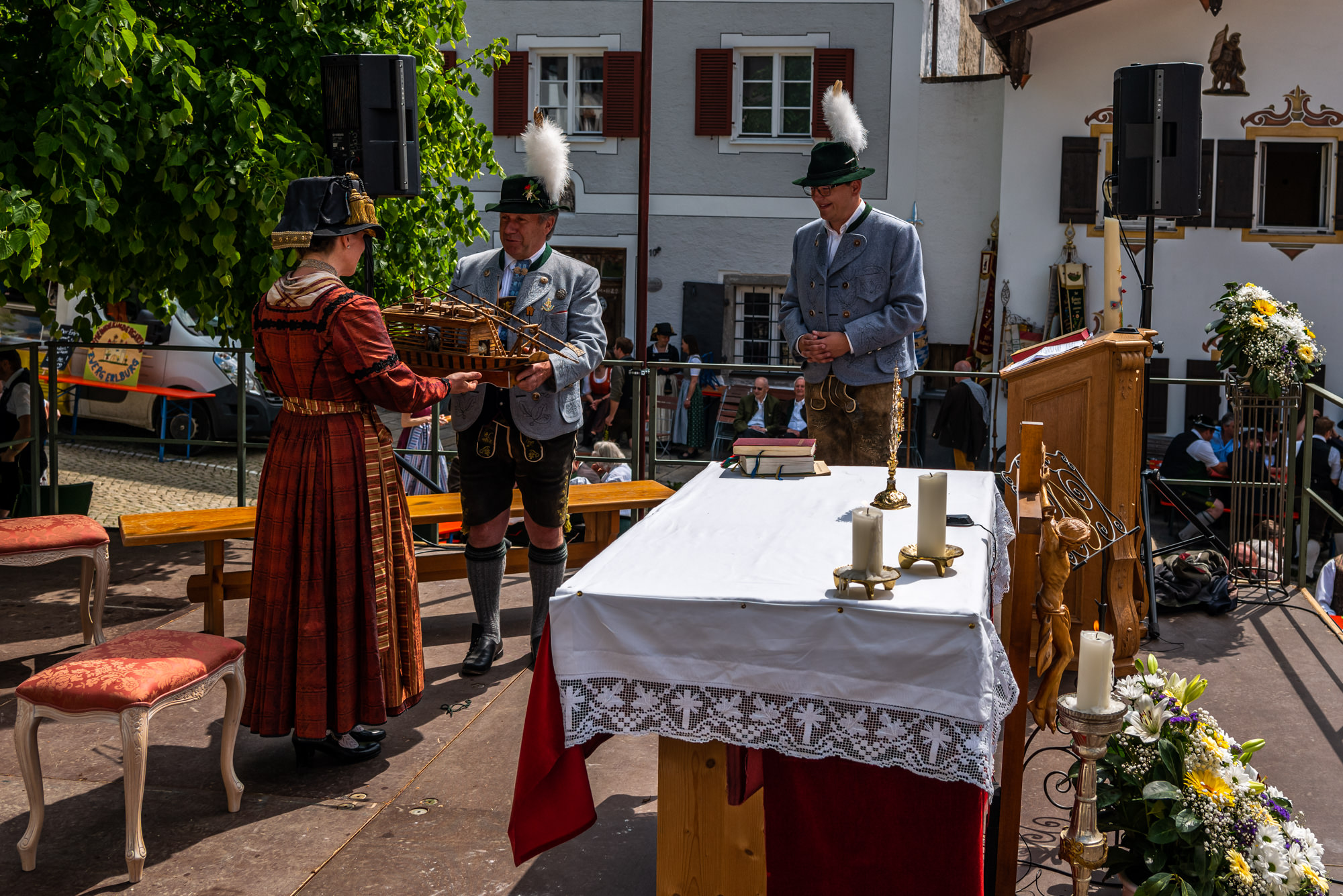 400 Jahre Neubeurer Schiffleutbruderschaft – Festsonntag: Bürgermeister Christoph Schneider (li.) und Zweiter Bürgermeister Wolfgang Sattelberger (re.) überreichten den Vereinschefs Juliane Tiefenmooser und Georg Wachinger das Modell eines Schiffs für das Museum.