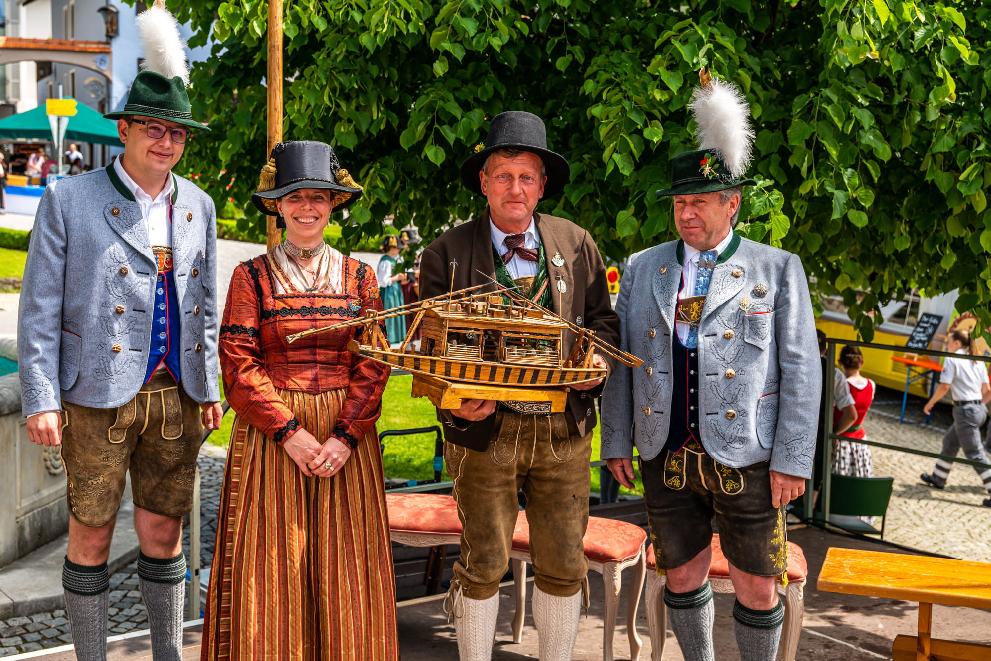 400 Jahre Neubeurer Schiffleutbruderschaft – Festsonntag: Bürgermeister Christoph Schneider (li.) und Zweiter Bürgermeister Wolfgang Sattelberger (re.) überreichten den Vereinschefs Juliane Tiefenmooser und Georg Wachinger das Modell eines Schiffs für das Museum.