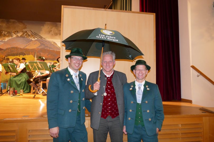 Noch knappe sechs Monate dauert es, bis in Bergen mit dem Bieranstich am 16.Juli 2020 das 130. Gaufest des Gauverbandes I beginnt. Gleichzeitig feiert der Bergener Trachtenverein sein 125-jähriges Vereinsjubiläum. Damit das Fest gut gelingt, ist natürlich schönes Wetter eine Grundvoraussetzung. Traditionsgemäß ist der Schirmherr für das Wetter zuständig, nur: so einen gab es bisher nicht! Dass Bergens Erster Bürgermeister Stefan Schneider der Wunschkandidat sei, stellte Vorstand Martin Heigermoser in der kürzlich stattgefundenen Generalversammlung schnell klar. In einer kurzen, humorvoll gehaltenen Betrachtung, ob dieser auch alle Kriterien für so ein Amt mitbringe, stellte er schließlich die entscheidende Frage: „Bist du bereit, die Schirmherrschaft für unser Fest 2020 zu übernehmen?“ Auf dem symbolisch überreichten Regenschirm, mit dem Bergens Ortsoberhaupt die Schirmherrschaft übertragen wurde, war der Schriftzug „Damit’s uns ned noss ei’geht!“ zu lesen. Heigermoser überreichte ihm den Schirm mit einem Augenzwinkern, dass der Schirmherr bestimmt wisse, dass es sich bei der Anspielung nicht zwingend um Regenwasser handeln müsse.