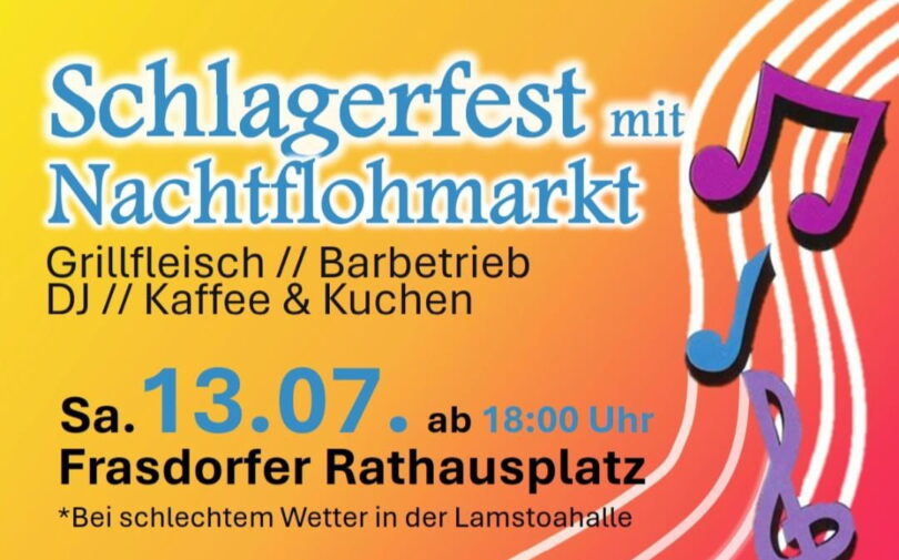 Am Samstag, 13. Juli ist es in Frasdorf wieder soweit: ab 18 Uhr gibt es auf dem Frasdorfer Rathausplatz wieder ein Schlagerfest mit Nachtflohmarkt.