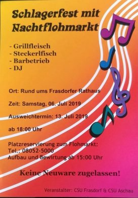 Die CSU-Ortsverbände von Frasdorf und Aschau veranstalten am Samstag, 6. Juli 2019 wieder einen großen Nachtflohmarkt begleitend zur Schlager-Sommernachtsparty.