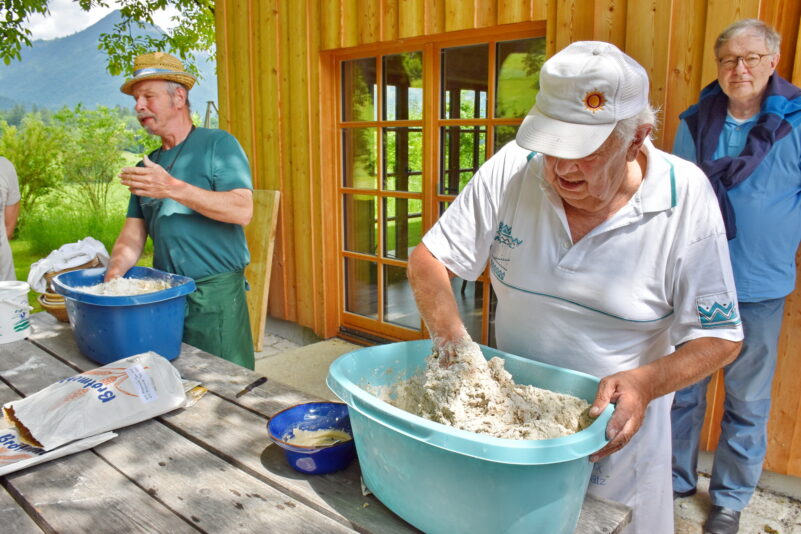 Altbürgermeister Fritz Irlacher und Hias Gasteiger hatten das Roggen- und Weizenmehl in größeren Mengen mitgebracht und beide weihten die Besucher in die Geheimnisse des Brotbackens ein. „Es braucht für ein gutes Brot nur drei Zutaten, Mehl, Wasser und Salz“ erklärte Fritz Irlacher. Aber die Seele ist der Sauerteig, der in einem kleinen Stück im Kühlschrank warten kann, bis das nächste Brot gebacken wird. Für dieses Anstellgut hatten die Besucher leere Glasgefäße mitgebracht, um zuhause das Gelernte in die Tat umzusetzen.