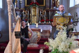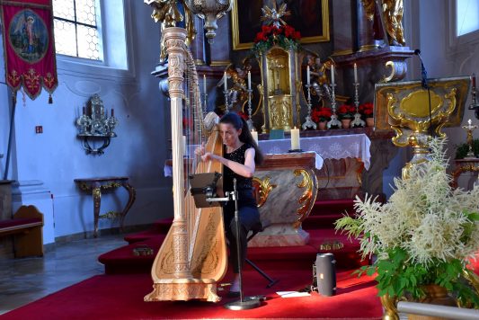 Otto Dufter, Leiter der Musikschule Grassau und Moderator des Abends, freute sich zum Abschluss, dass die Künstlerin trotz ihrer vielen internationalen Termine Zeit für ein Konzert in Schleching fand im Rahmen der Reihe „Musik für die Seele“. Da die Künstlerin auch als Autorin tätig ist, zitierte Dufter aus ihrem Buch eine lustige Passage „Lebenslänglich frohlocken – Skurriles aus dem Leben einer Harfenistin“.