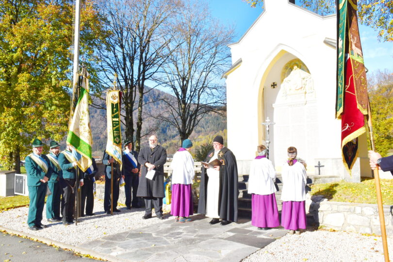 Passend zum Ende des Kirchenjahres und des Volkstrauertages stimmte die Musikkapelle Schleching unter Leitung von Walter Reisenauer tongewaltig die Deutschen Messgesänge von Michael Haydn an. In der Pfarrkirche standen die Fahnenabordnungen am Altar und Pfarrer Peter Bergmaier forderte die zahlreichen Besucher zum Denken und Nachdenken an diesem Tag auf. Die Frage „welchen Sinn geben wir unserem Leben“ stand zunächst im Kirchenraum in Zeiten des Chaos und der Katastrophen, wie es auch schon im gelesenen Evangelium geschildert wurde. Der Pfarrer sah die Hoffnung, die erste Richtung im Leben und das Licht in der Dunkelheit bei Christus.