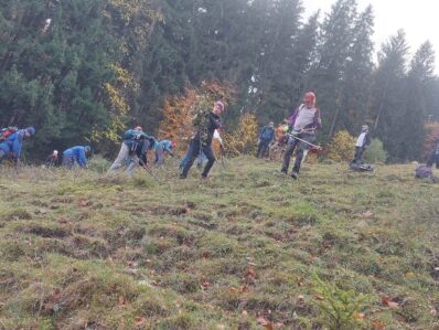 Die Überraschung und Freude war groß, als immer mehr Freiwillige morgens um neun Uhr mit Sägen, Äxten, Zwickern und Motorsägen auf dem Geigelsteinparkplatz eintrudelten. Aus Schleching, aus dem Achental und dem Chiemgau trafen die Helfer und Helferinnen ein. Die am weitesten angereisten kamen aus Straubing. Gemeinderat Andi Hafner hatte seine ganze Familie zum Helfen aktiviert. Auf die Frage, was denn ihre Motivation sei, wurde geantwortet „wir sind hier an der frischen Luft“ oder „ich will mich bei der Abfahrt nicht im Brombeergestrüpp verfangen“.