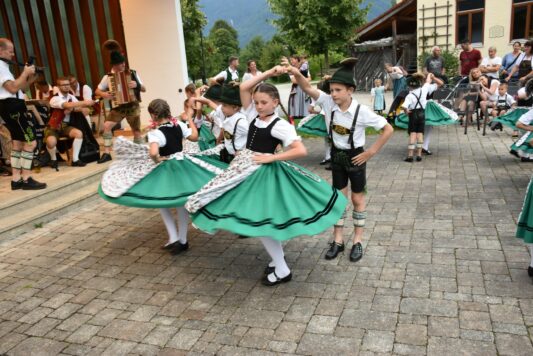 Die Musikkapelle Schleching unter Leitung von Walter Reisenauer spielte zünftig auf und sorgte mit ihren Klängen für beste Stimmung. Die ganz jungen Trachtler zeigten ihr Können und sorgten für gezückte Kameras, um das schöne Bild festzuhalten.