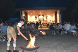 Romantisch wurde es als die Feuerschalen angezündet wurden und auf allen Tischen Kerzen. Aber zu einem zünftigen Sommernachtsfest gehört wohl auch der Gewitterschauer, der die Besucher unter das Dach am Bürgerhaus und unter die Grillhütte flüchten ließ. Auch als der Dorfplatz nur noch von den zuckenden Blitzen erhellt wurde, spielte die Musikkapelle fröhlich weiter, denn im Musikpavillon saßen sie trocken.