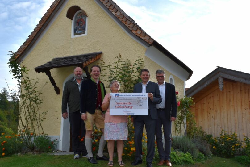 Schleching – Die Unterstützung von ehrenamtlichem Engagement und die Erhaltung von Kulturgütern in der Region sind unter anderem Ziele der VR Bank Rosenheim – Chiemseestiftung. Dafür haben sich Johann Hell (Abteilungsleiter Stiftungs- und Generationenmanagement), Klaus Hatzel (Direktor und Stiftungsvorstand) und Engelbert Pletschacher (Hauptgeschäftsstellenleiter) von der meine Volksbank Raiffeisenbank vor der kleinen Kapelle in Mühlau eingefunden. Dazu kamen der Bürgermeister von Schleching, Josef Loferer und die Hauptinitiatorin Cäcilia Wehweck-Loidl. Die Mühlauerin ist die treibende Kraft zum Erhalt der Ortskapelle.