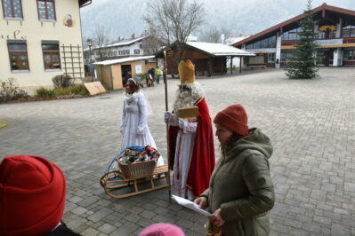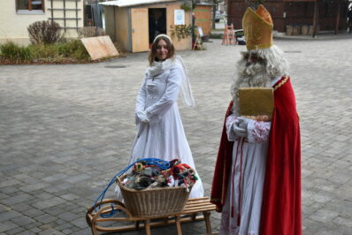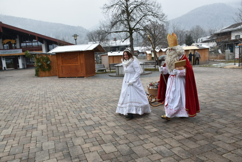 Leise rieselte der Schnee vom Himmel und die Kleinen des Kindergartens liefen mit ihren Betreuerinnen durchs Dorf und suchten den Nikolaus. Der kam dann, als die Kinder die eingeübten Advends-Lieder schön laut im Musikpavillon vortrugen. Der Heilige Nikolaus kam herunter vom Geigelstein mit einem Engel und zog einen Schlitten mit gefüllten Socken. Ein Kind fragte etwas bang, wo denn die Krampein sein, aber der Nikolaus beruhigte die Kleinen und meinte, die schlafen noch. Dann schlug er sein großes goldenes Buch auf und erzählte den Kindern, was er so von oben vom Berg beobachtet hatte.