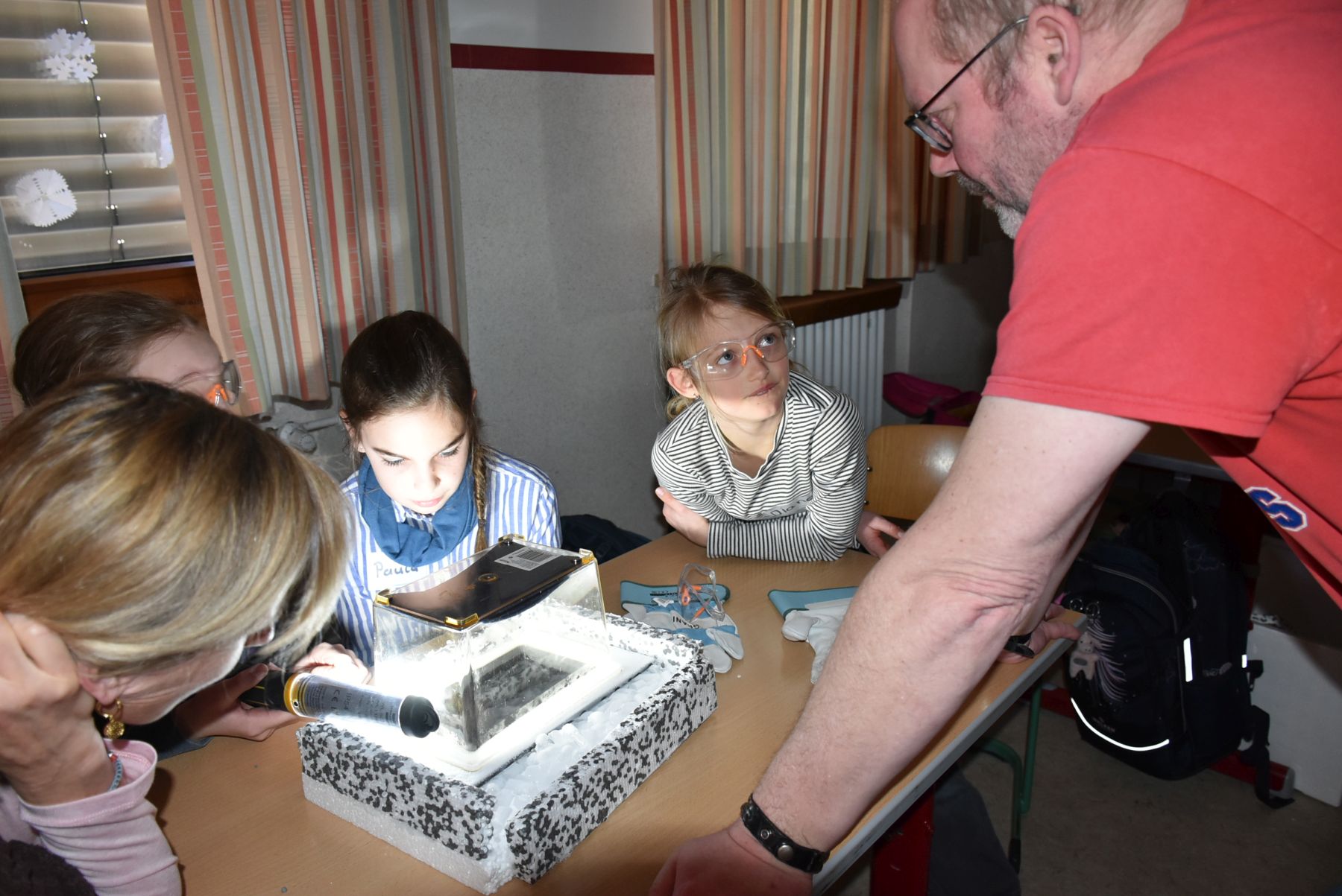 die Schülerinnen und Dr. Ralf Averbeck beim Beobachten der Teilchen in der Nebelkammer