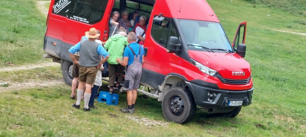 Die Idee und Organisation hatte der Leiter des Sozialen Netzwerkes Schleching, Wolfgang Zintel übernommen. Natürlich wusste er Rat und der Shuttlebus nahm den Weg über die Schattenseite zur Alm, so dass alle Senioren den Tag genießen konnten, auf den sie sich so gefreut hatten. Gerhard Bernd aus Raiten vom Fuhrbetrieb Günter Dirnhofer brachte alle gut und sicher auf das idyllische Almweidegebiet auf 920 Metern Höhe.