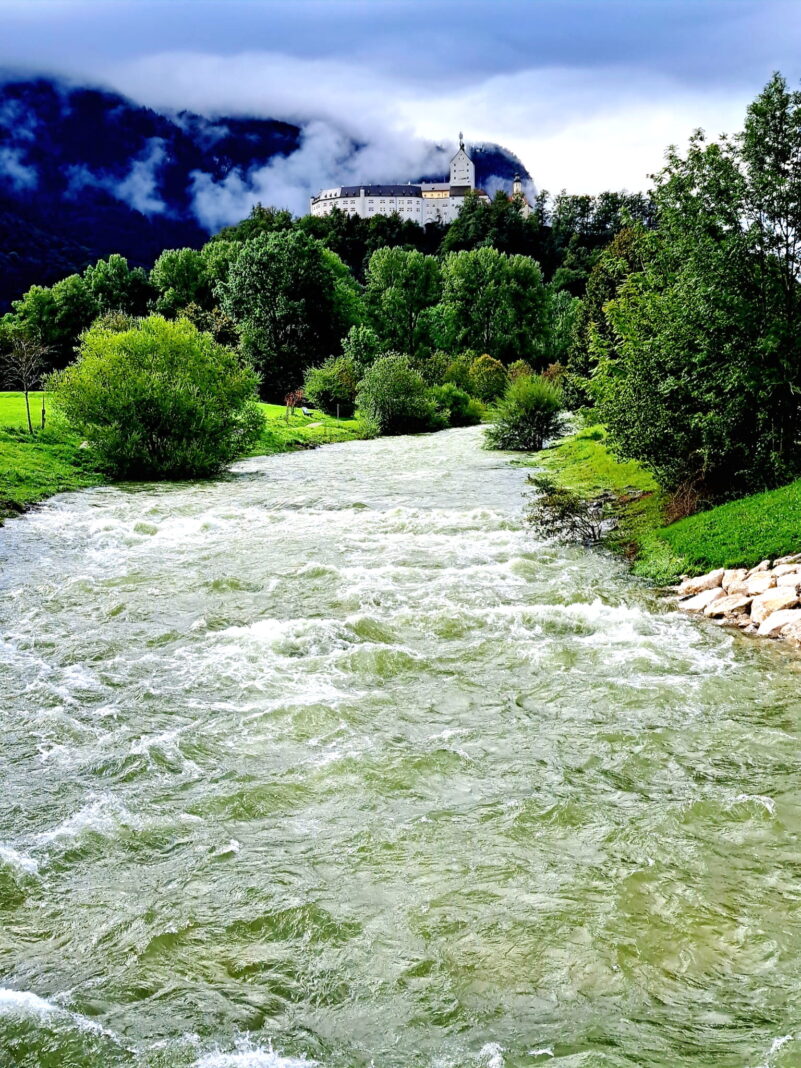 In eindrucksvollen Farben präsentiert sich die Prien mit dem herrschaftlichen Schloss Hohenaschau – wie diese aktuelle Aufnahme mit der reißenden und mitreißenden Prien zeigt.