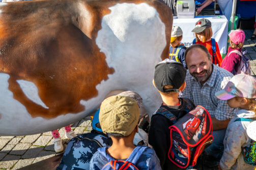 Liebling der Kinder war Kälbchen Rehlein. Begleitet wurde Rehlein von seiner Mama Regina. Zehn Jahre ist die Kuhdame alt und hat insgesamt bereits acht Kälber auf die Welt gebracht. Der Auftritt vor großem Publikum war für Regina aber neu. Zu Beginn schaute sie darum schon etwas nervös in die Runde. Aber mittels vieler Streicheleinheiten ihrer Besitzer und einigen Leckerlies nahm sie den Trubel zunehmend gelassen. Regina und Rehlein waren nicht die einzigen tierischen Vertreter. Vor Ort waren auch noch zwei Schafe und ein ganzer Bienenstaat in einem Schaukasten.