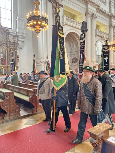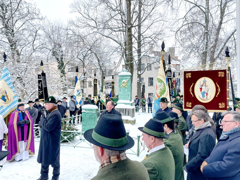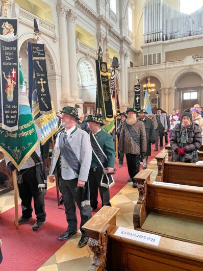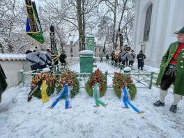 Die Fahnenabordnungen der Vereine trafen sich um 9 Uhr in der Gaststätte Tannengarten. Um 10 Uhr ging’s dann im Kirchenzug, voran die Aubinger Blaskapelle (da spielt auch Stefan Semoff vom BR mit,) gefolgt von der Gaustandarte, Ehrengästen, Gauausschuss und dann den Fahnenabordnungen und Trachtlern zum feierlichen Gottesdienst in der Sendlinger Kirche St. Margaret, der seit Jahrzehnten vom Unterhachinger Dreigsang musikalisch begleitet wird. Anschließend folgte der Marsch zur alten Sendlinger Kirche, wo auf dem umlaufenden Friedhof am Denkmal zur Sendlinger Mordweihnacht 1705 vier Kränze mit begleitenden Grußworten niedergelegt wurden. Zuerst von Stadtrat Alexander Reissl für die Landeshauptstadt München, für den Isargau von Gauvorstand Wolfgang Gensberger, Herbert Reich für den Verein Schmied Kochel und dann Markus Lutz für den Bezirksausschuss Sendling. Abschließend sangen alle gemeinsam “Stille Nacht” und die Minusgrade mit den verschneiten Gräbern haben ihr übriges zur feierlichen Stimmung beigetragen. Zum Ausklang ging’s -zusammen mit den Freunden vom Trachtenverein “Chiemgauer” München (Chiemgau-Alpenverband) im Kirchenzug wieder zurück zum Tannengarten.