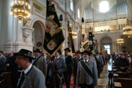 Nach dem traditionellen Weißwurstfrühstück setzte sich der Zug, begleitet von der Aubinger Blaskapelle, geordnet in Richtung Kirche St. Margaret in Bewegung. Dort wurde mit Pfarrer Franz Frank die Jahrtagsmesse gefeiert. Musikalisch gestaltet wurde der Gottesdienst vom Hachingtaler Dreigesang, der die Bauernmesse von Annette Thoma in bewährter Weise vortrug. Zum Abschluss erklang von der Orgel traditionell die Bayernhymne „Gott mit Dir, Du Land der Bayern“, die von der Gemeinde mitgesungen wurde.