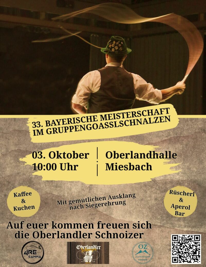 Auf Einladung der Oberlandler kommt es am Freitag und Feiertag, 3. Oktober zu den inzwischen 33. Bayerischen Meisterschaften im Gruppen-Goaßlschnalzen.