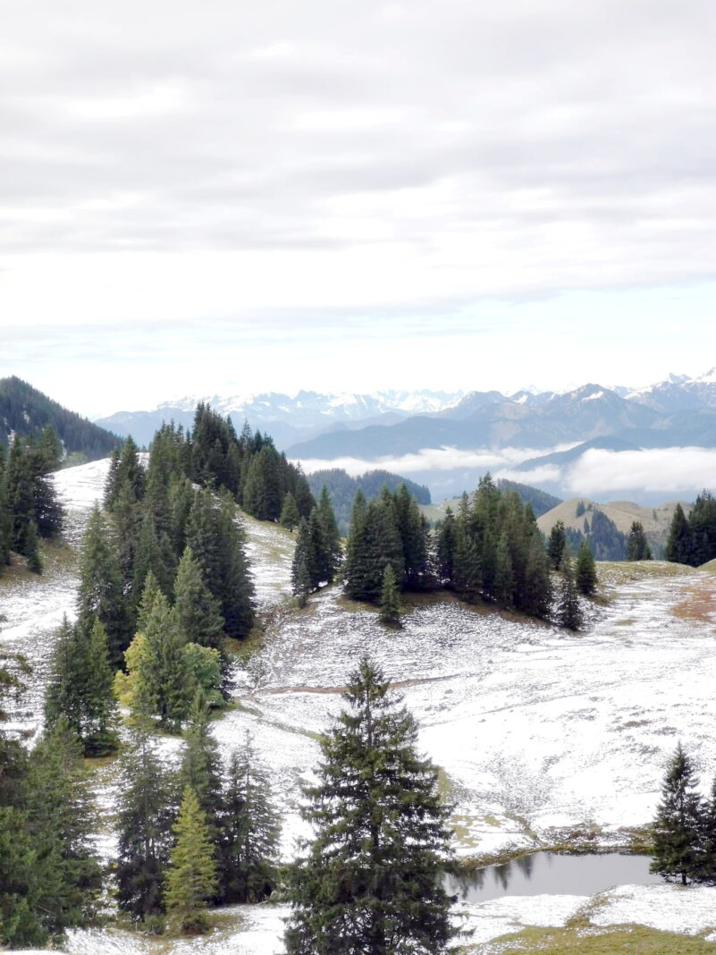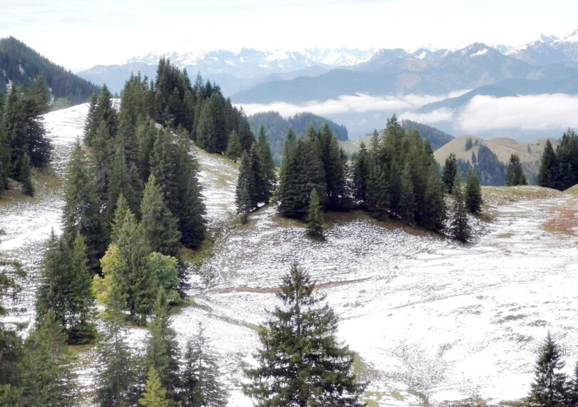 Der Winter hat leise Einzug gehalten im Priental und auf den Chiemgauer Bergen – so sind die ersten Schneefelder in den noch grünen Almwiesen zu finden.