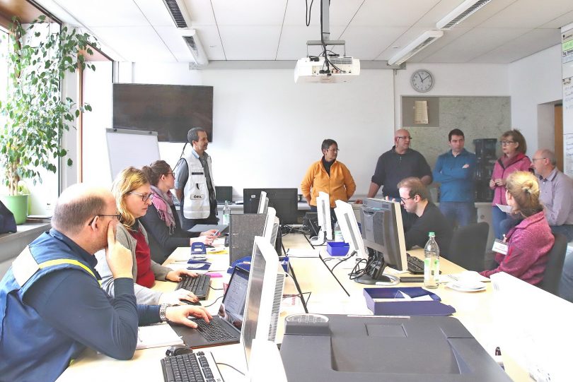 Neben den Mitarbeiterinnen und Mitarbeitern aus dem Landratsamt und den Hilfsorganisationen sind Kreisbrandrat Richard Schrank in der Funktion des Örtlichen Einsatzleiters und rechts neben ihm, die Leiterin der Koordinierungsgruppe Bettina Bauer zu sehen.