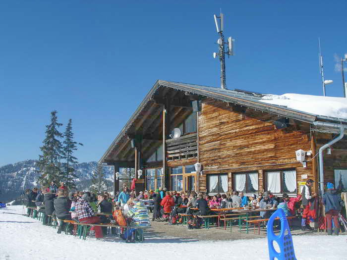 Gegenüber vom Parkplatz betreten wir die Forststraße mit Wegweiser. Auf dieser bleiben ostwärts auf der Forststraße, bis sie bald eine Rechtskurve macht. Bei der nächsten Gabelung halten wir uns links und steigen weiter bergauf, bis wir in die Nähe der Bergstation des Lifts gelangen. Dort ist es auch nicht mehr weit zur Berggaststätte (bei der Gabelung links) und noch ein Stück weiter nördlich zur Bezoldhütte (bei der Gabelung rechts). Diese ist zwar nicht bewirtschaftet, besitzt aber eine Sitzgelegenheit und lädt bei guter Fernsicht zum Blick auf Watzmann und Hochkalter ein.
