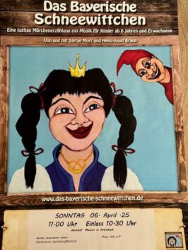 die Figuren singen Lieder, unterhalten und streiten sich, lachen miteinander und Schneewittchen erlebt ihr Abenteuer auf eine ganz eigene und bayerische Weise…