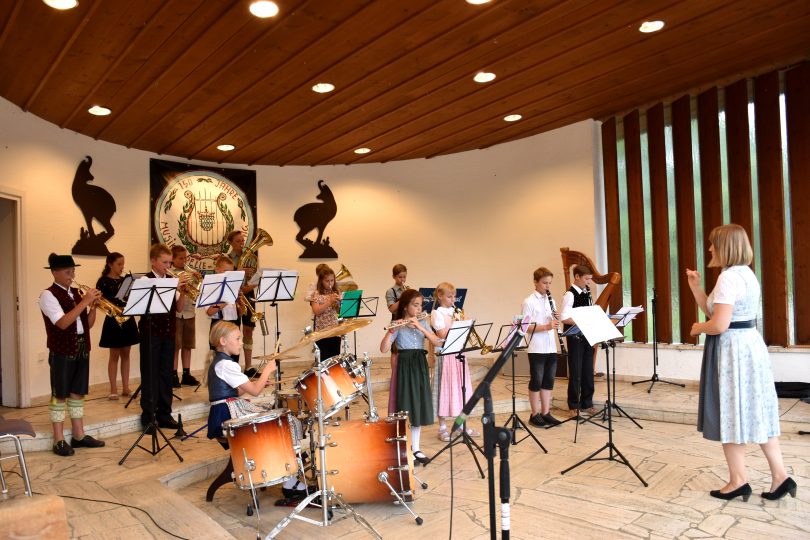 Marlene Noichel erklärte zwischen den Auftritten anschaulich die verschiedenen Musikinstrumente, die die Schüler in der Musikschule Grassau oder in einer der sieben Zweigstellen erlernen können. Dass sie auch singen können zeigten die Trachtenkinder bei ihrem letzten Auftritt mit dem „Bibihenderl“ Kurz bevor der große Regen einsetzte spielte das Kinderorchester eine Polka und ein rockiges Stück und ließ ein begeistertes Publikum lange applaudieren.