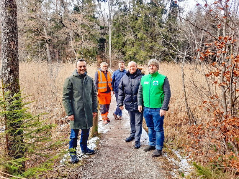 Bericht und Bilder: Gemeinde Eggstätt – Das Gruppenbild zeigt (v.l.n.r.): Bad Endorfs Bürgermeister Alois Loferer, Eggstätts Bauhofleiter Wast Weber, Eggstätts Bauamtsleiter Bernd Ruth, den Eggstätter Bürgermeister Christian Glas und Patrick Guderitz, Gebietsbetreuer „Eggstätt-Hemhofer Seenplatte und Seeoner Seen“