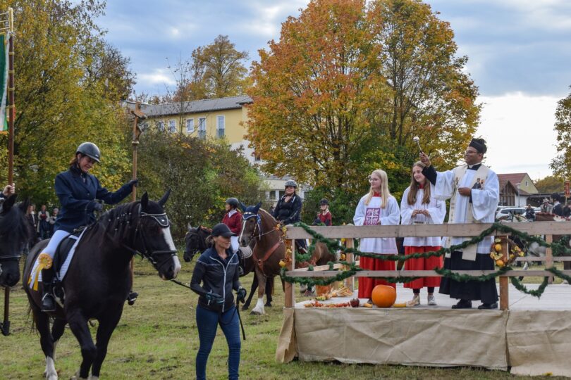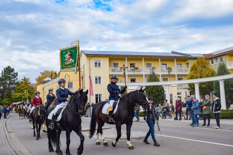 Eröffnet wurde der Leonhardiritt am frühen Nachmittag mit einem Konzert der Blaskapelle Mühlhausen, sowie Volkstänzen des Trachtenvereins Neustadt a.d.Donau und des Volkstrachten-verein D´Ilmtaler Münchsmünster. Anschließend begrüßten Margit Zettl-Feldmann, die Vorsit-zende des Tourismusverbandes Bad Gögging, und Hannah Roßbauer vom RC Aribo die vielen Besucher an der Römerbad-Wiese. Margit Zettl-Feldmann erklärte dabei die Tradition des Leon-hardiritts, bei dem der Segen für Pferde, Vieh, das Haus und den Stall erbeten wird. Der Heilige Leonhard gilt seit Jahrhunderten als Patron der Gefangenen und des Viehs, vor allem der Pferde. Nach der Begrüßung trafen die Teilnehmer des Leonhardiritts auf der Römerbad-Wiese ein. Die Pferde wurden auch dieses Jahr wieder von ihren Besitzern besonders herausgeputzt und festlich geschmückt. Über die vielen verschiedenen Pferde und Kutschen freuten sich die großen, aber vor allem auch die kleinen Besucher, die ganz aufgeregt die Anzahl der Pferde vor jeder Kutsche mit-zählten. Im Anschluss folgte die Segnung der Reiter, Pferde und Gespanne durch Pfarrer Alex Thekkekutt, sowie der Umzug durch den Ort. Beim Ritt durch den alten Ortskern von Bad Gög-ging konnten sich die Reiter und Kutschen nochmals den vielen Besuchern entlang der Straßen präsentieren.