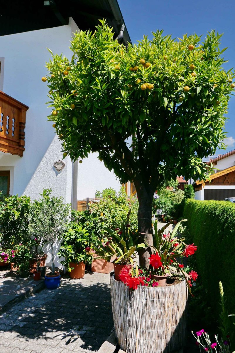 „Warum in die Ferne schweifen, wenn das Gute so nah ist“ – gemäß diesem Lebensmotto verbringen Maria und Peter Freund aus Prien-Siggenham ihre Sommertage im heimischen Garten. Südländisches Lebensgefühl kommt dabei allein schon wegen der über 20 Orangen-, Mandarinen- und Zitronenbäume auf. Seit Jahrzehnten prägen diese Südfrüchte den Garten der Familie Freund, besonders stolz ist diese auf einen großen Mandarinenbaum, der ursprünglich aus Sizilien kommt, aber schon seit fast drei Jahrzehnten im Chiemgau reiche Früchte hervorbringt. Nach einigen Sonnen-Wochen ist wieder Erntezeit, im Winter werden die gesamten Bäume in eine örtliche Gärtnerei zur Überwinterung gebracht.