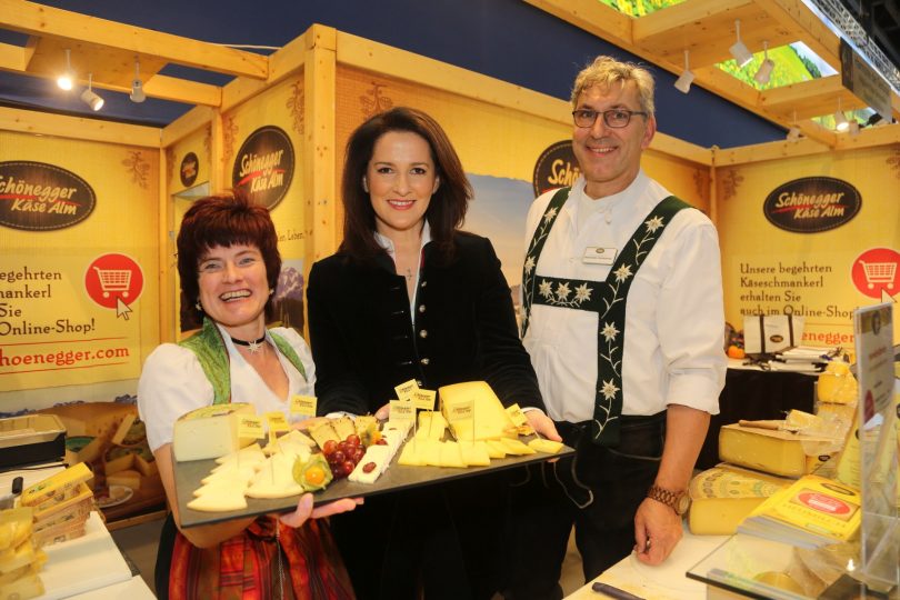 Als Heimat der Genüsse präsentiert sich der Freistaat derzeit auf der Internationalen Grünen Woche in Berlin. In der eigenen Bayernhalle können die Besucher der weltgrößten Ernährungsmesse zehn Tage lang entdecken und probieren, welche kulinarischen Genüsse und unvergleichlichen Spezialitäten der Freistaat zu bieten hat. Auch die Schönegger Käse-Alm aus Steinwies im Landkreis Weilheim-Schongau ist heuer unter dem Berliner Funkturm mit von der Partie. Landwirtschaftsministerin Michaela Kaniber schaute bei ihrem Messerundgang am Stand der Heumilch-Spezialisten vorbei und unterstützte Käse-Sommelière Roswitha Boppeler und deren Ehemann Alexander Holdenried bei der Vermarktung der feinen Käseschmankerl.