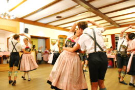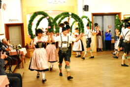 Visuelle und akustische Höhepunkte waren die Auftritte der Goaßlschnalzer, eine ebenfalls perfekt aufeinander abgestimmte Performance, die nur etwas ausgebremst wurde durch die zu tief hängenden Lampen im Saal. Aber mit einem Positionswechsel klappte die alte Fuhrmannstradition. Mit Geschick und Muskelkraft konnten zur Musik passende präzise Töne erzeugt werden. Die Jugendgruppe tanzte das „Mühlradl“, wobei der Vortänzer jeden Figurenwechsel durch Stampfen anzeigt. Das Klappern des Mühlrades wird durch abwechselnden Takt mit Sohle und Ferse des rechten beziehungsweise linken Fußes mit je zweimal auf den Boden klopfen nachgeahmt. Der Figurenwechsel ging rasch und klappte perfekt. Der „Steirer“ wurde von den „Aktiven“ getanzt, es machte den Eindruck, dass dieser Tanz besonders beliebt bei den Ausführenden ist, vielleicht weil er mit einem langen Busserl und Stemmen endet.