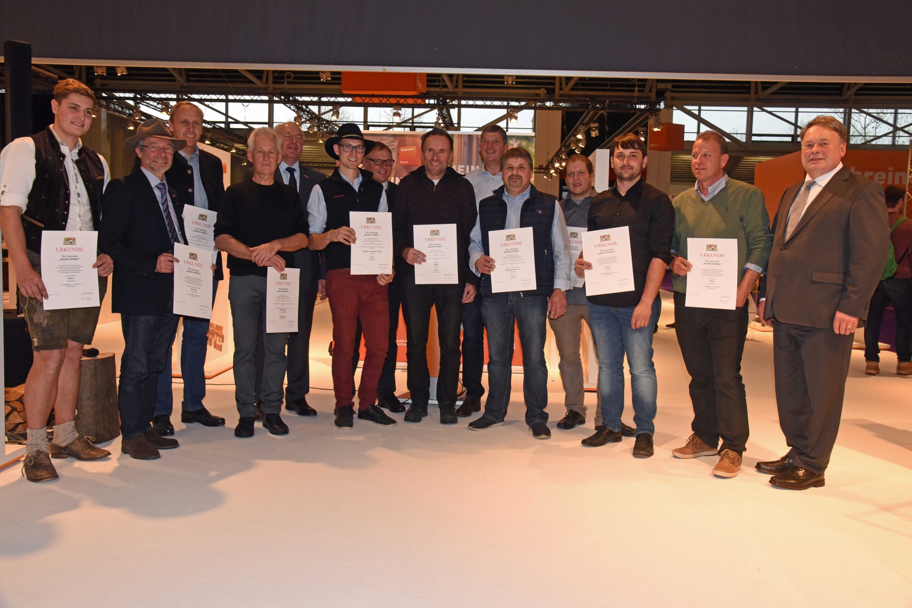 Preisverleihung des Schreinerpreises 2017 in München – Von links nach rechts: Alexander Huber, Josef Pfab, Richard Stanzel, Gerhard Schranner, Handwerkspräsident Franz Xaver Peteranderl, Moritz Schmidt, Schreinervizepräsident Bernhard Daxenberger, Richard Siegler, Stefan Opperer, Wolfgang Sachs, Michael Ruppert, Marco Hofer, Kilian Pfohl und Staatsminister Helmut Brunner.
