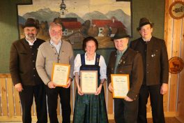 Bericht und Fotos: Heinrich Rehberg – 160 Jahre Erfahrung im Schützenverein „Chiemgauadler“ Umrathshausen: Schützenmeister Sepp Staudacher (rechts) und sein Stellvertreter Thomas Bachmann übergaben bei der Jahreshauptversammlung der Schützengesellschaft „Chiemgauadler“ Umrathshausen die Ehrenurkunde für 60-jährige Vereinsmitgliedschaft an Friederike Panhans Josef Scheck (zweiter von rechts) und Sepp Pollich (zweiter von links) wurden für 50 Jahre ausgezeichnet.