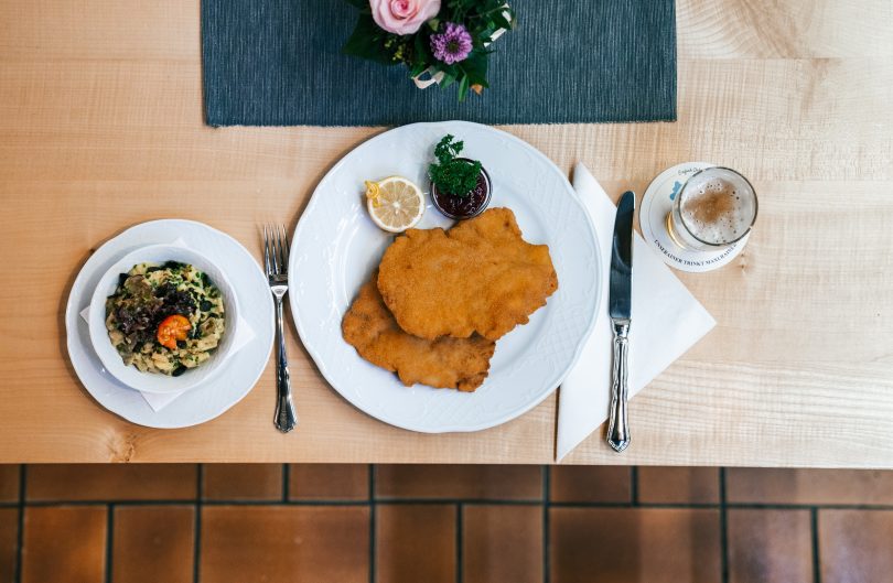 Immer montags gibt es ab 17:30 Uhr alle möglichen Schnitzelvarianten. Selbstverständlich sind Klassiker wie das Wiener Schnitzel, Jägerschnitzel und Champignonrahmschnitzel dabei, dann gibt es auch ein Steirer Schnitzel mit Kürbiskernpanade und auch weniger bekannte Kreationen wie ein Caprese-Schnitzel oder das Honolulu-Schnitzel. Auch für vegetarische Alternativen ist gesorgt.