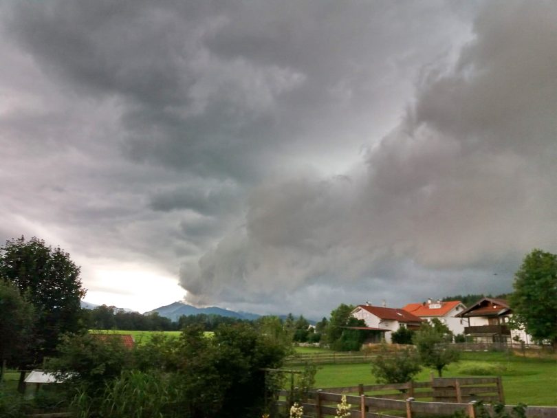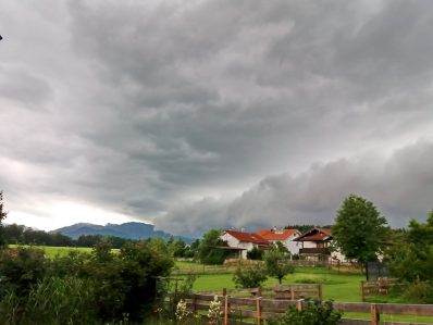 Schweres und dunkler Gewölk, wie es von Prien-Bachham heute zu sehen war, ließ nichts Gutes verheißen. Die Wolken waren Vorboten eines schweren Sturmgewitters, das über Halfing und Umgebung niederging und über die wir an anderer Stelle durch den Pressedienst des Landratsamtes berichten.