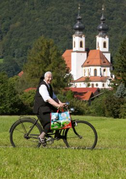 5_Sr. Berlinde als Fotomodell für die Aschauer Tourist Info_Foto Berger: Sr. Berlinde mit Aschau-Tasche flott auf dem Fahrrad unterwegs vor der Aschauer Pfarrkirche „Darstellung des Herrn“