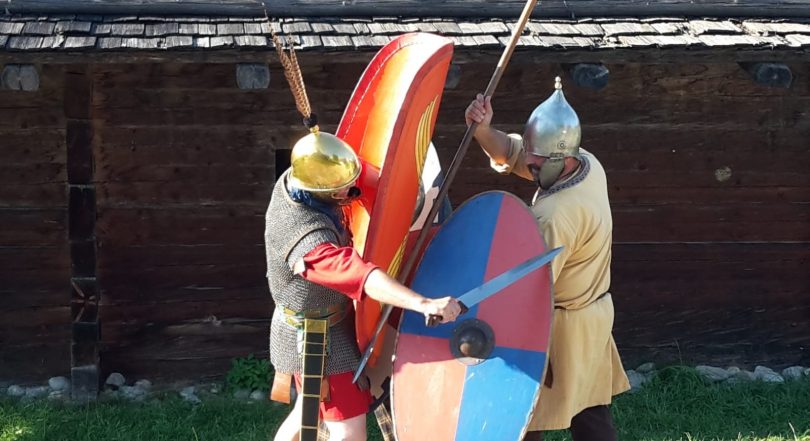 Foto: Birgit Ehgartner/Trostberg – Bildunterschrift: Kampfvorführung zwischen einem römischen Legionär und einem keltischen Krieger im Keltengehöft Stöffling.