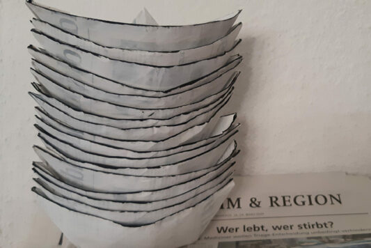 Während der Coronazeit hat die Künstlerin Siglinde Berndt für jeden an und mit Corona Verstorbenen aus Stadt und Landkreis Rosenheim ein „Seelenschifferl“ aus Zeitungspapier gebastelt. Es sind fast 1.000 Schifferl geworden. Es war eine Zeit im Ausnahmezustand und der Extreme. „Man spürt, dass überall ein Schicksal dahintersteckt“, berichtet die Künstlerin. Angehörigen war es wegen Quarantäne-Regeln und Besuchsverboten verwehrt Sterbende zu begleiten. Beschäftigte im Gesundheitswesen sind immer wieder weit über die eigenen Leistungsgrenzen hinaus gegangen. Das lässt niemanden kalt und wirkt nach.