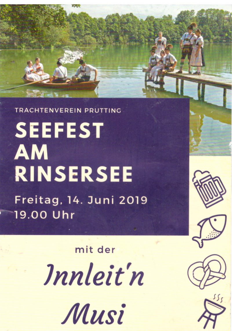 Ein Seefest am Rinser See veranstaltet der Trachtenverein Prutting am Freitag, 14. Juni – mit der Innleit´n-Musi, bei jedem Wetter, mit Steckerlfischen und Grill-Brotzeiten, mit Flötzinger-Märzen und Hüpfburg sowie mit Auftritten der Trachtenjugend, der Aktiven und der Goaßlschnalzer. Der Ort: Seeleiten 1 in 83569 Vogtareuth.