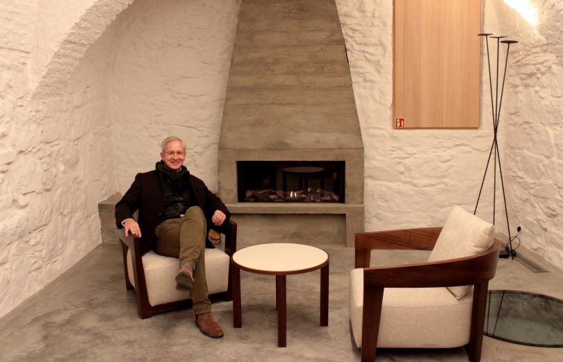Foto: Geschäftsführer Gerald Schölzel vor dem Offenen Kamin des Kramerhauses – der Platz für vertrauliche Gespräche.