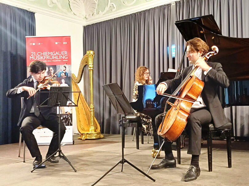 Debussys späte Sonate, komponiert 1915/16, ist Klang gewordene, reine Poesie. Debussy selbst sagte zu dieser artifiziellen, durchgeistigten Kammermusik: „Sie ist schrecklich melancholisch. Ich weiß nicht, ob man dabei lachen oder weinen soll. Vielleicht beides zugleich?“ Auf diese Weise glücklich eingestimmt nahm das Publikum im fast ausverkauften Festsaal von Kloster Seeon auch das folgende frühe Werk des Schweizer Komponisten Frank Martin (1890 bis 1974) begeistert auf – das „Trio sur des melodies populaires irlandaises“ von 1925, also ein fröhliches, variantenreiches Trio in drei Sätzen über irische Volkslieder. Mit ansteckender Spiel und Lebensfreude, harmonisch vollkommen aufeinander eingespielt, musizierten zusammen Diana Ketler am Flügel, der junge, in St. Petersburg geborene Aylen Pritchin auf der Geige und Valentin Radutiu am Cello.