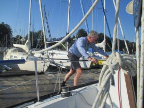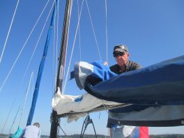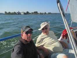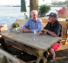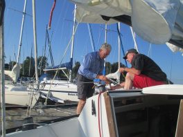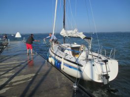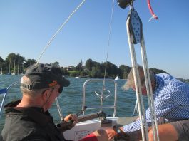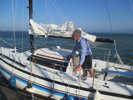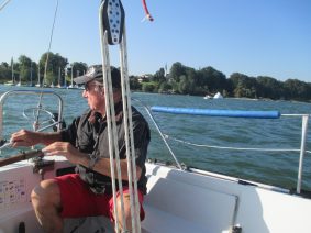 Eines schönen Tages war es dann soweit, der Wind war gerade richtig, das Wetter stabil und zu Dritt ging es los. Die Brigenna liegt in der Stippelwerft. War gar nicht so einfach, vom Anlegersteg auf das Boot zu klettern, aber ich schaffte es ohne ins Wasser zu fallen und fand ein sicheres Plätzchen, von wo aus ich die Startvorbereitungen der beiden erfahrenen Segler beobachten konnte. Dann gings los, die ersten Meter noch mit Unterstützung eines Elektromotors, außerhalb des Hafens dann mit dem Wind. Segeln ist eine anspruchsvolle Sportart. Nachdem man der Landratte die wichtigsten Begriffe und Verkehrsregeln auf dem Wasser erklärt hatte, durfte ich sogar ans Steuer und überraschenderweise schaffte ich es auch, das Boot im Wind zu halten.