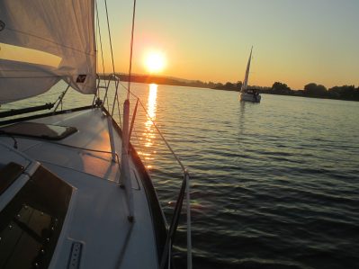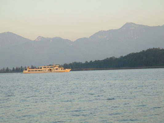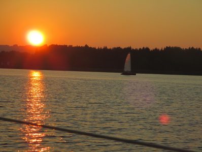 Wir umkurvten die Herreninsel, passierten die Fraueninsel und nahmen Kurs auf Gollenshausen, wo wir anlegten und uns ein Bier genehmigten. Dann gings zurück nach Prien, wo wir bei abflauendem Wind erst ziemlich spät ankamen, dafür aber als Höhepunkt eines wunderschönen Segelturns einen grandiosen Sonnenuntergang erleben durften. Segeln kann wirklich auch etwas für Genießer sein!