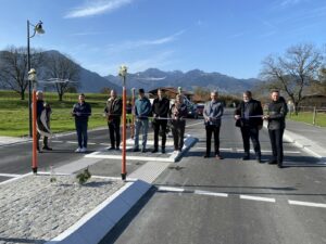 Diakon Ludwig Guggenberger, Alexander Eisner (Gebietsabteilungsleiter, Staatliches Bauamt Rosenheim), Michael Stief (Kurz&Stief Ingenieure), Roland Bründl (Projektleiter, Staatliches Bauamt Rosenheim), Dr. Hermann Streicher (Bereichsleiter, Staatliches Bauamt Rosenheim), Susanne Grandauer (1. Bürgermeisterin, Gemeinde Nußdorf), Helmut Brunner (2. Bürgermeister, Gemeinde Nußdorf), Michael Runz (Bauleiter, Firma Hans Holzner), Konstantin Becker (Leitung Tiefbau, Firma Hans Holzner).