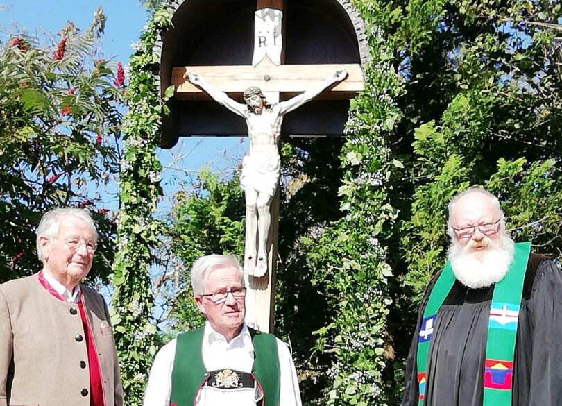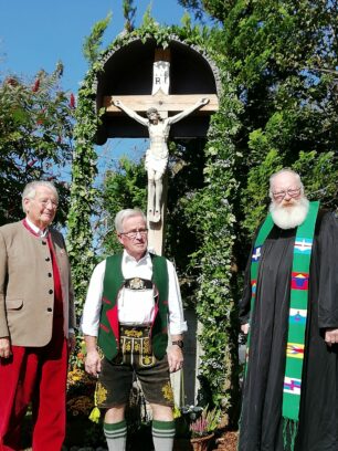 „Vor etwa 125 Jahren erhielt das Kreuz den Segen der katholischen Kirche, jetzt wurde nach der umfassenden Renovierung der evangelische Segen noch drauf gelegt“. Grundstückseigner Dr. Thomas Wrede lud seine Bekannten und die Nachbarn ein zur großen Kreuzweihe und alle folgten dem Ruf. Pfarrer Wackerbarth erinnerte sich an seine ersten Begegnungen mit den vielen oberbayerischen Kreuzen in Feld und Flur, ein Brauch, den er aus seiner Heimat nicht kannte. Mittlerweile habe er sich an die vielen Kreuze gewöhnt und bezeichnete sie als wichtige Zeichen am Wegrand und für die dort wohnenden und vorbeikommenden Menschen. Paul Panzer, Ehrenoberleutnant der Priener Gebirgsschützen war ehrenamtlich gut 40 Stunden tätig und hat dem gesamten Werk mit Corpus Christi, Marienfigur, Kreuzbalken und Dach einen neuen Anstrich gegeben. „Mittlerweile habe ich etwa 60 bis 70 Feldkreuze restauriert, der Schwerpunkt der Arbeiten lag anfangs im Raum Prien und Frasdorf, doch arbeitete ich in den letzten Jahren schon im gesamten Landkreis Rosenheim bis weit hinein nach Tirol“, erinnert sich Paul Panzer.