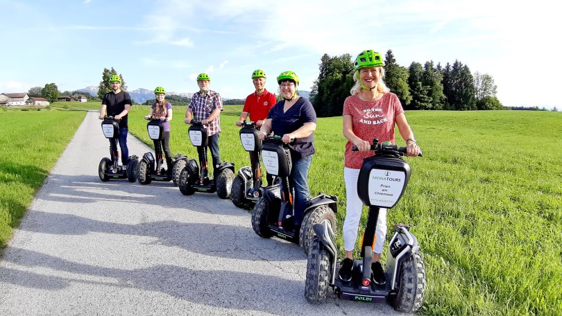 Bis Oktober 2022 hat man immer mittwochs die Möglichkeit auf einer abenteuerlichen Panoramafahrt das hügelige Umland von Prien am Chiemsee zu erkunden. Ausgerüstet mit Segways, elektrisch angetriebene Einpersonen-Fahrzeuge, und einem professionellen Guide fahren die Teilnehmer:innen auf einer abwechslungsreichen Wegstrecke entlang einer Anhöhe zwischen der Ratzinger Höhe und den Chiemgauer Bergen. Angekommen am ersten Haltepunkt haben die Segway-Fahrer:innen freie Sicht auf die gesamte Bergkette – vom Wendelstein bis zum Hochgern. Weiter gehts zum nächsten Aussichtspunkt, von dort hat man einen Postkartenblick auf den Chiemsee, die Christkönigskirche zu Wildenwart und die Kampenwand. Anschließend geht es mit den Offroad-Segways über Forstwege zurück zum Ausgangspunkt. Treffpunkt zu der zirka eineinhalbstündigen „Segway – Panoramatour Prien“ ist jeweils um 11 Uhr in Elperting 4 (Wastlhof), in Prien/Atzing. Eine Voranmeldung ist bis zum Vortag bei Monatours unter der Telefonnummer +49 176 603 877 31 erforderlich. Die Mindestteilnehmerzahl beträgt zwei Personen, die maximale Gruppengröße sind sieben Teilnehmer:innen.