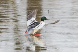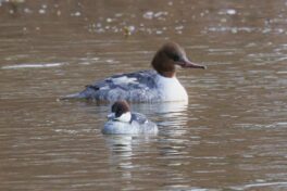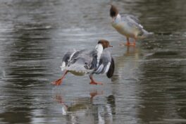 Auf einem kleinen Eisrest im Weiher in der Feldwieser Bucht schlitterten Gänsesäger wie Schlittschuhläufer über die nasse Eisbahn, die schon am nächsten Tag verschwunden war. Ein Zwergsägerweibchen, ein Wintergast aus dem Norden, fischte einträchtig mit der großen Verwandten, das Gänsesägerweibchen.
