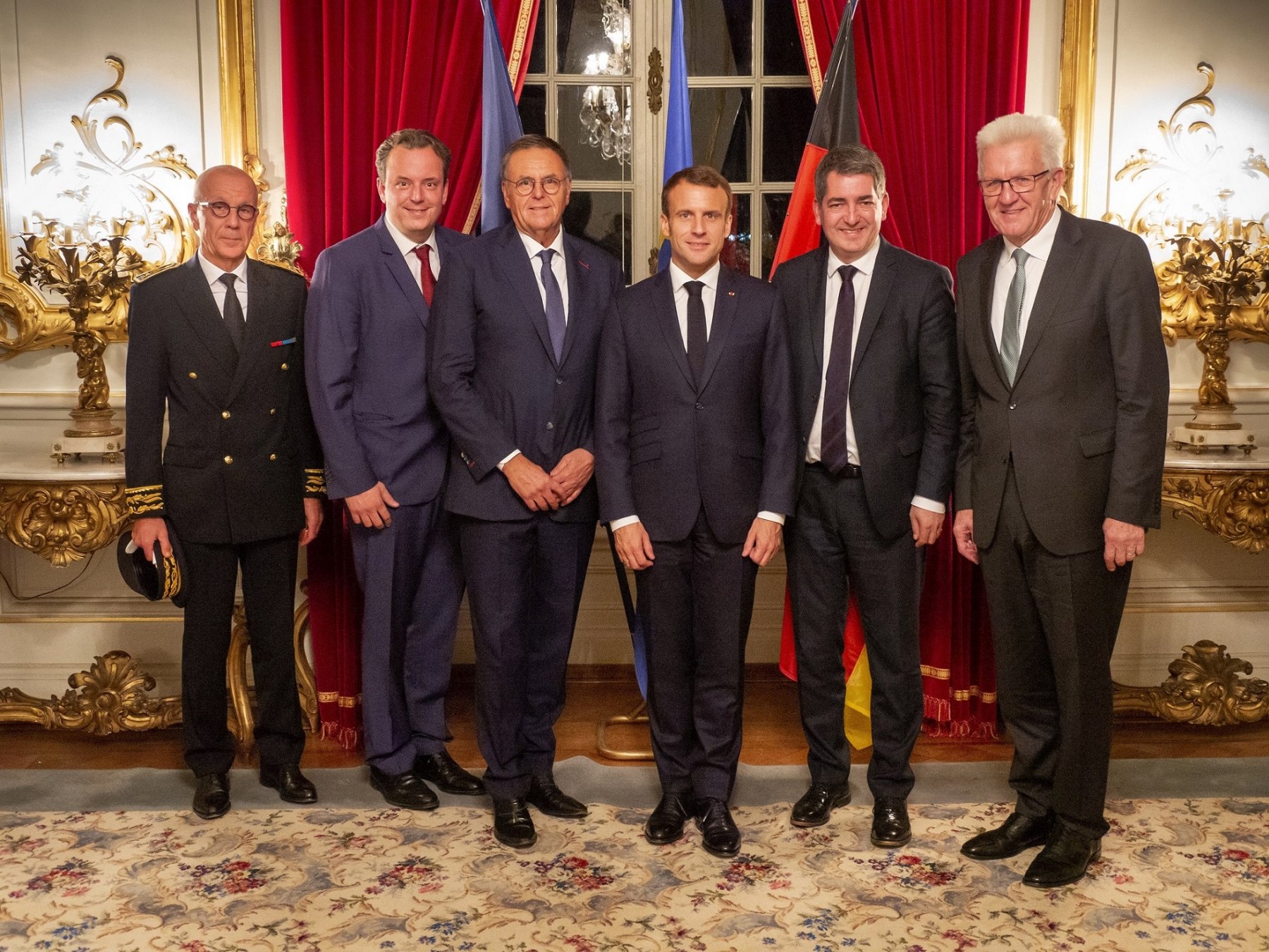 Schulterschluss für deutsch-französische Vision: Jean-Luc Marx (Préfet de la Région Grand Est), Michael und Roland Mack (geschäftsführende Gesellschafter des Europa-Park), Emmanuel Macron (Président de la République française), Jean Rottner (Président de la Région Grand Est), Winfried Kretschmann (Ministerpräsident Baden-Württemberg)